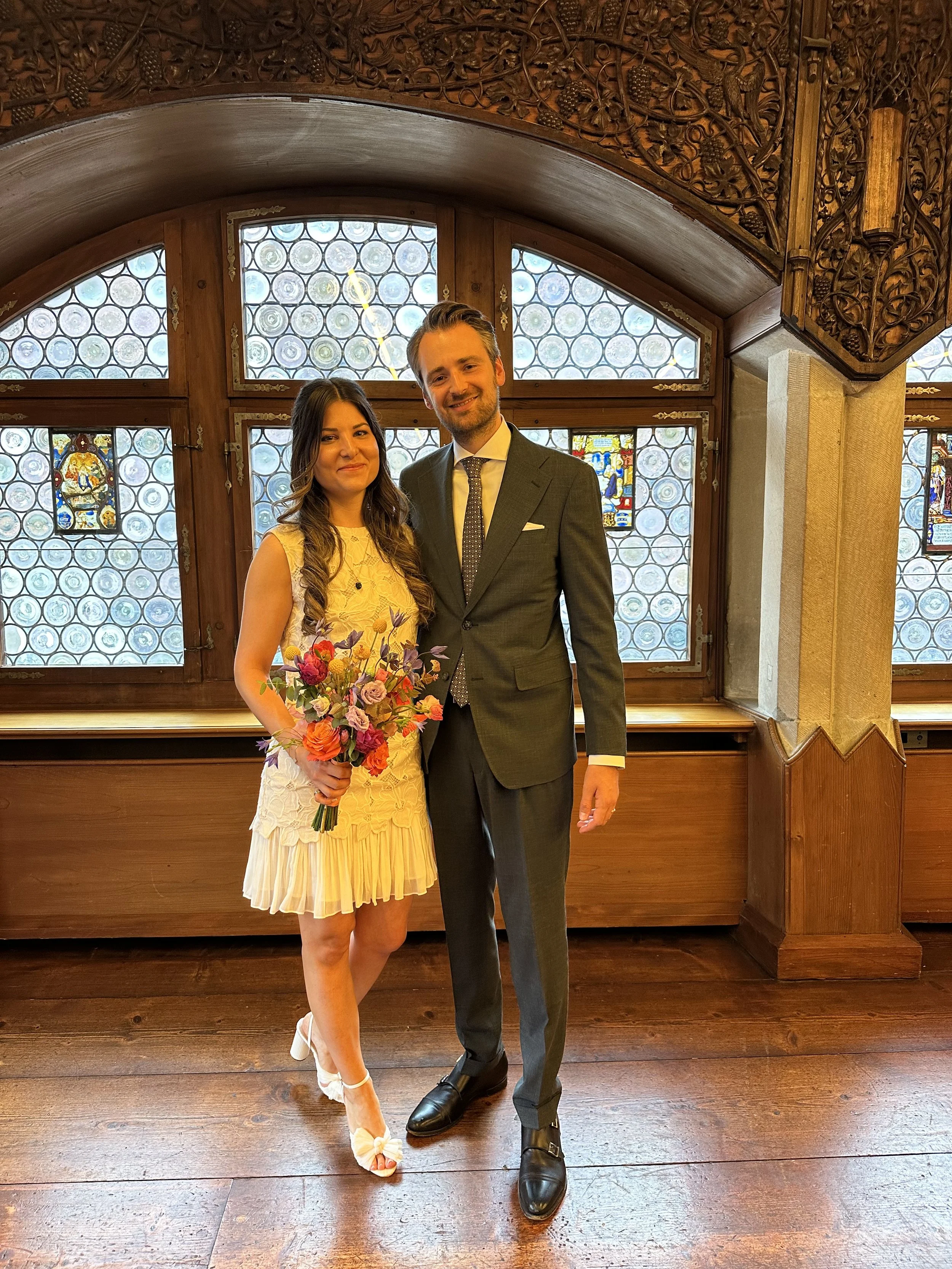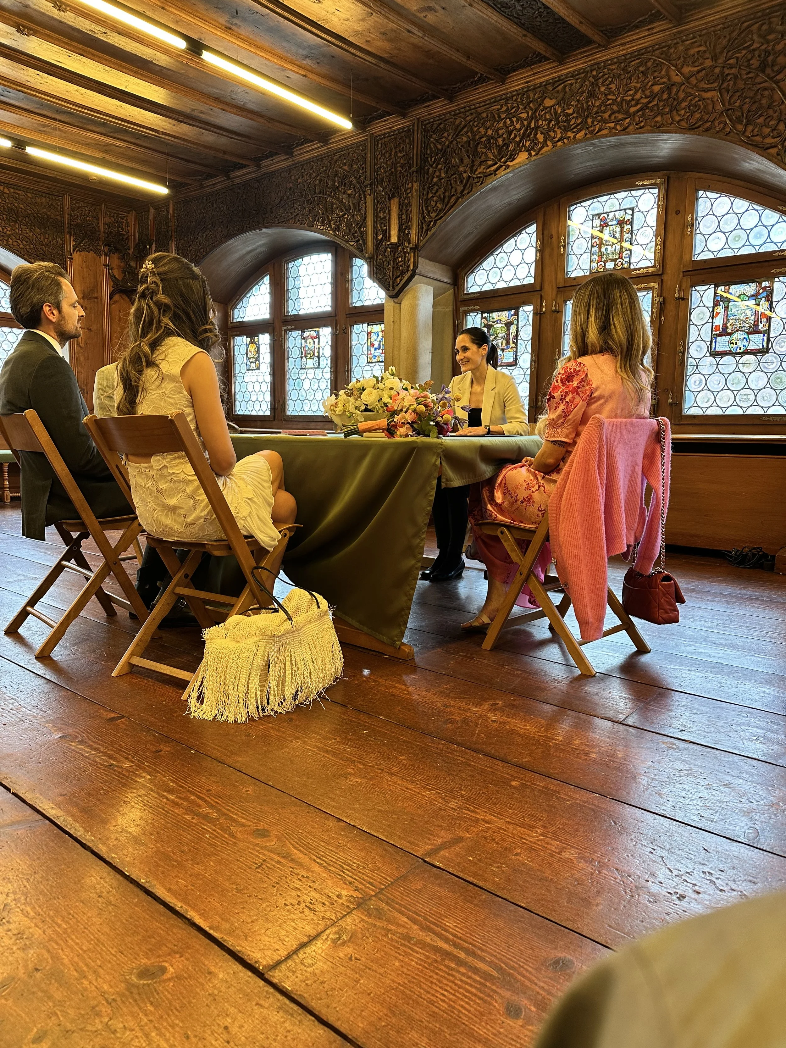 Um die Wünsche des Paars umzusetzen, unterstützte ich bei der Koordination mit Dienstleistern, dem Tagesablauf und einer dezenten Begleitung am Hochzeitstag. Die Trauung fand im historischen Rathaus in Zug statt, gefolgt von einem Aperitif im stimmungsvollen Rathauskeller mit rund 30 Gästen.