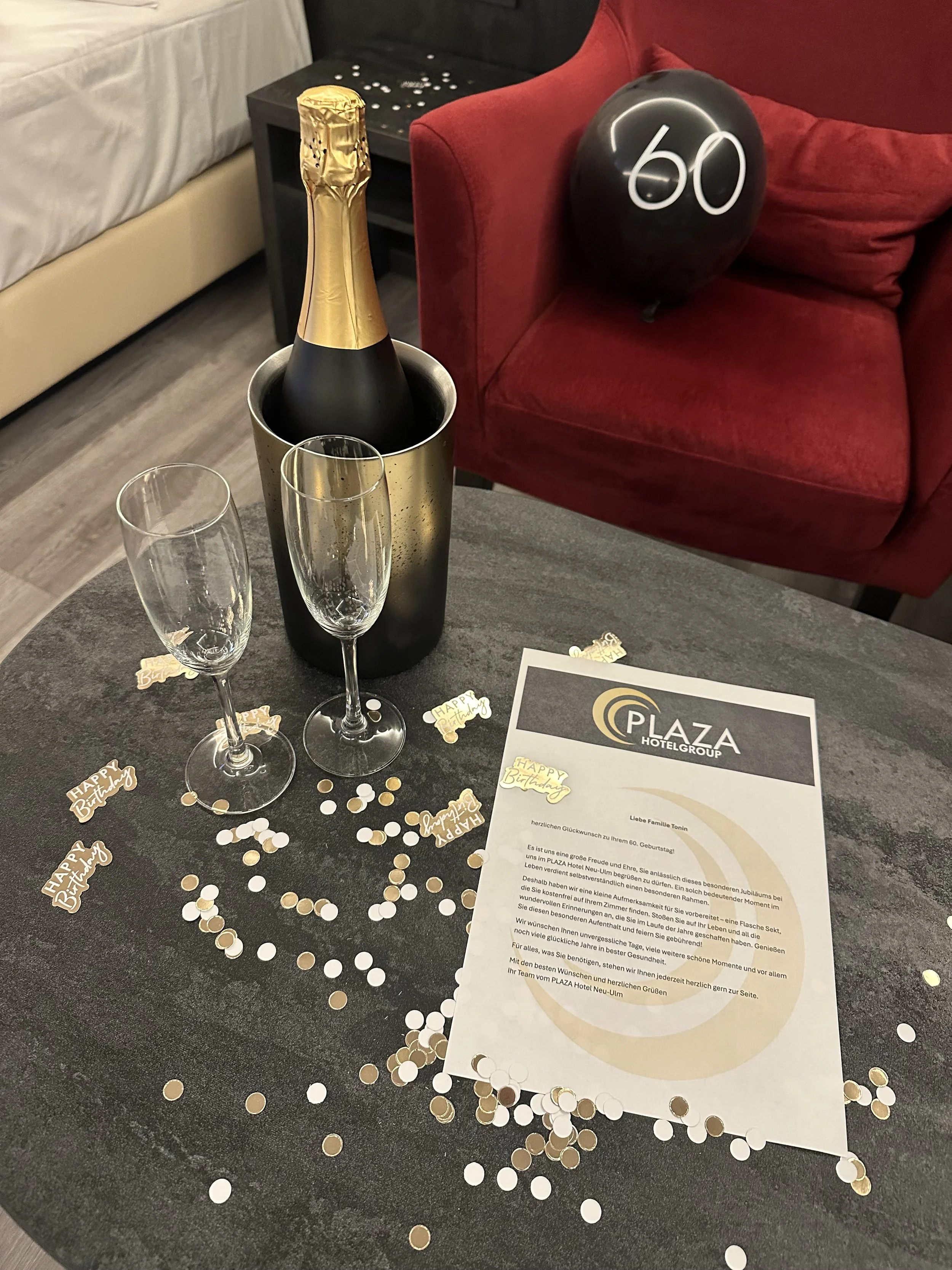 Upon arrival, the couple was welcomed with a beautifully styled room featuring birthday décor and a chilled bottle of Prosecco waiting to be opened — a small gesture that set the tone for a warm and joyful weekend ahead.